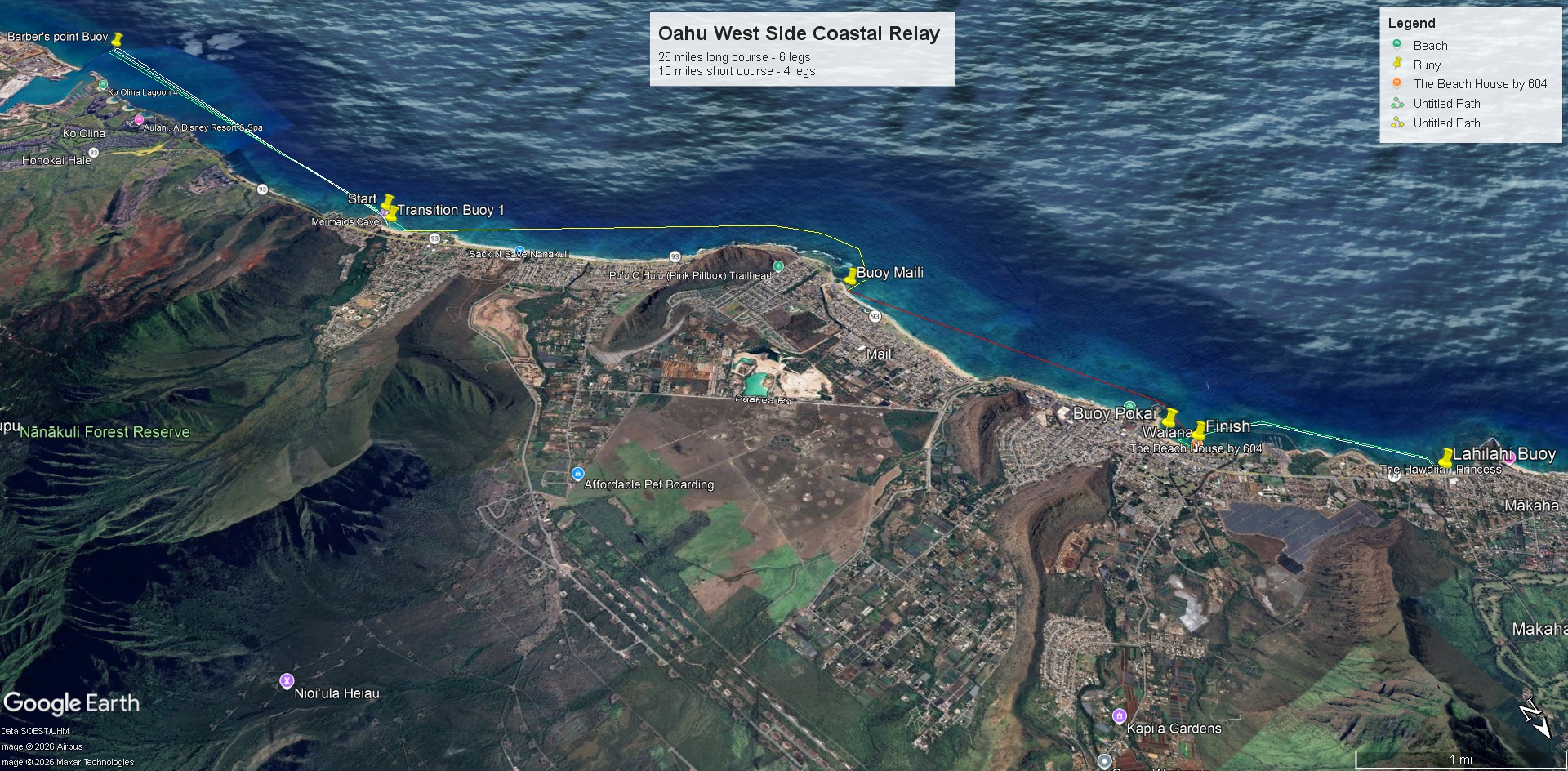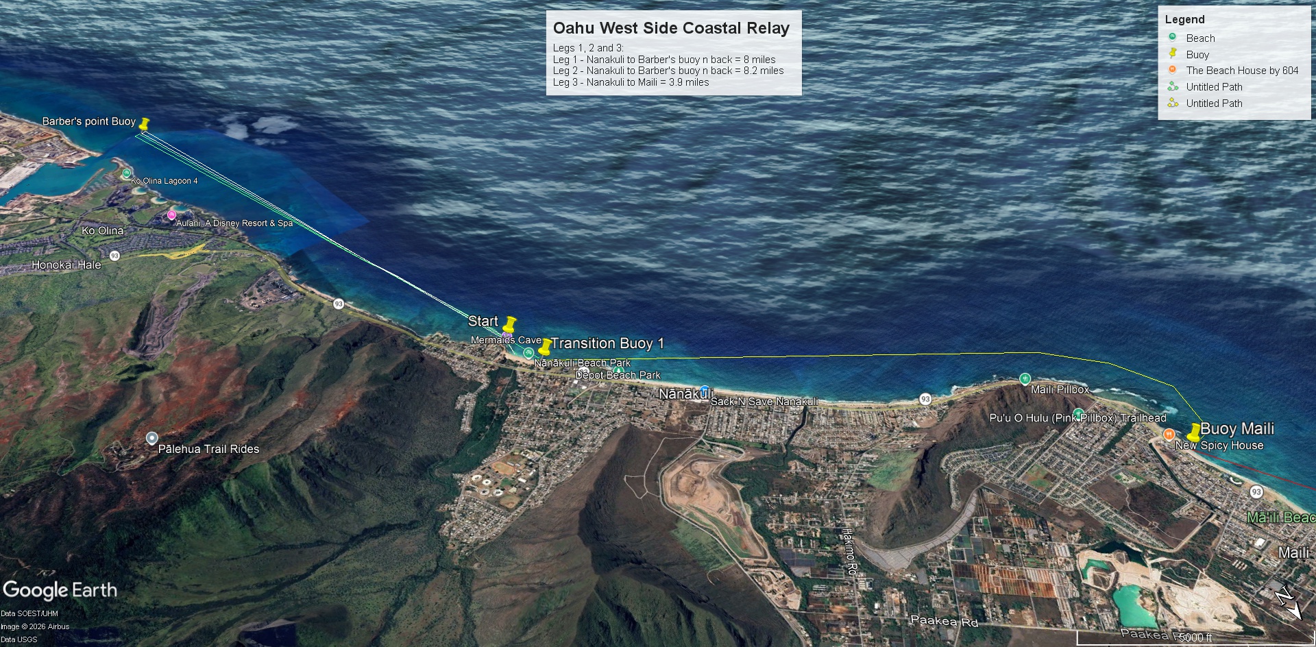 Leg 1 & 2 will start at Nanakuli Beach Park, go to the Barber’s Point Buoy and return back to Nanakuli: 8 miles each leg